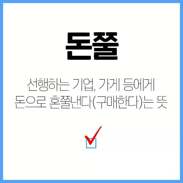 돈쭐: 선행하는 기업, 가게 등에게 돈으로 혼쭐낸다(구매한다)는 뜻.(对为社会做贡献或者很良心的企业,就要用发不完的订单教他做人。)